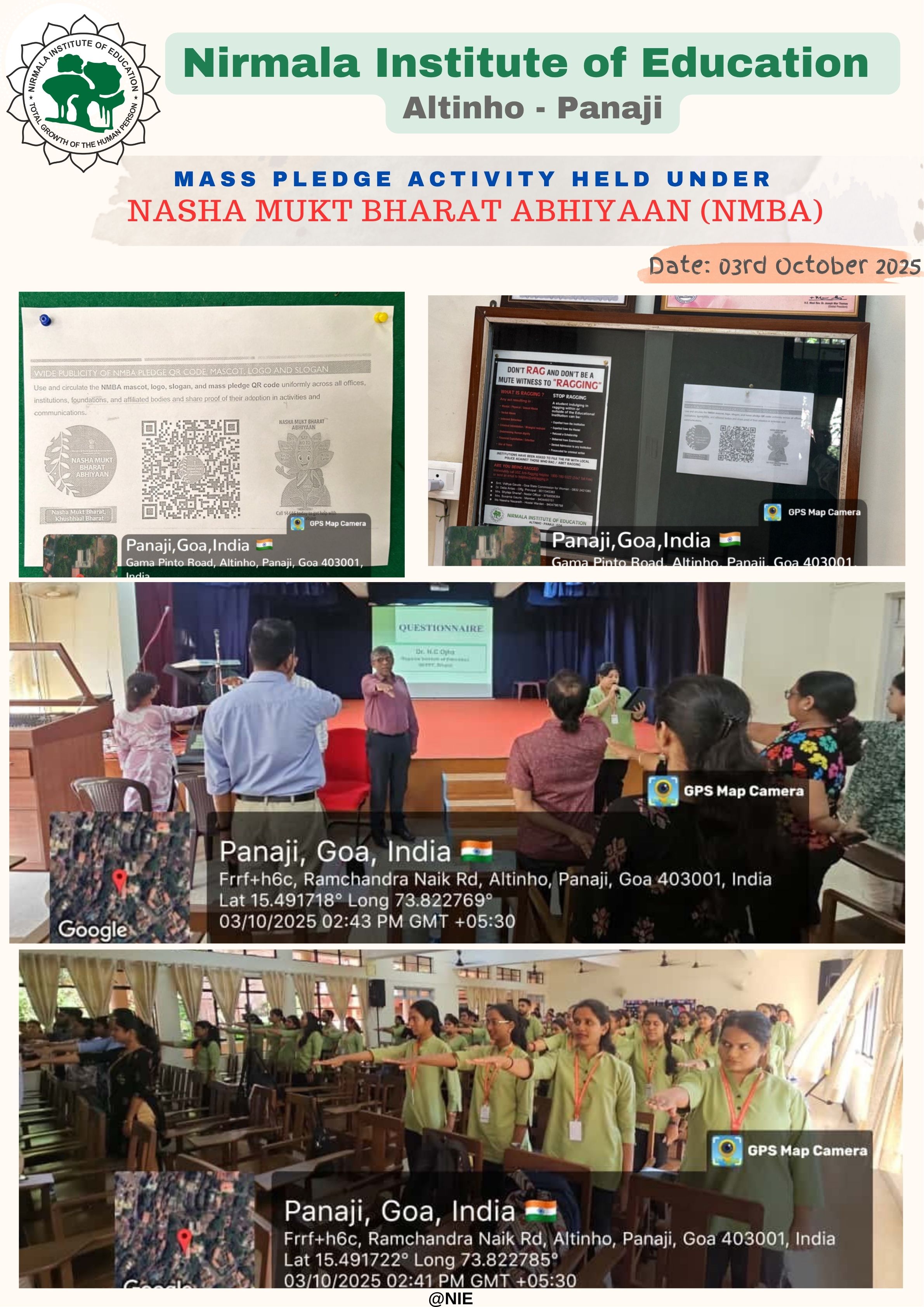 As part of the nationwide campaign to commemorate the 5th Anniversary of the Nasha Mukt Bharat Abhiyan (NMBA) initiated by the Department of Social Justice and Empowerment (DoSJE), Government of India, the Nirmala Institute of Education, Altinho-Panaji, organized a Mass Pledge activity on campus. The pledge-taking ceremony at the Institute was organized in the college auditorium on 3rd October 2025 from 2:45 p.m. to 3:00 p.m.